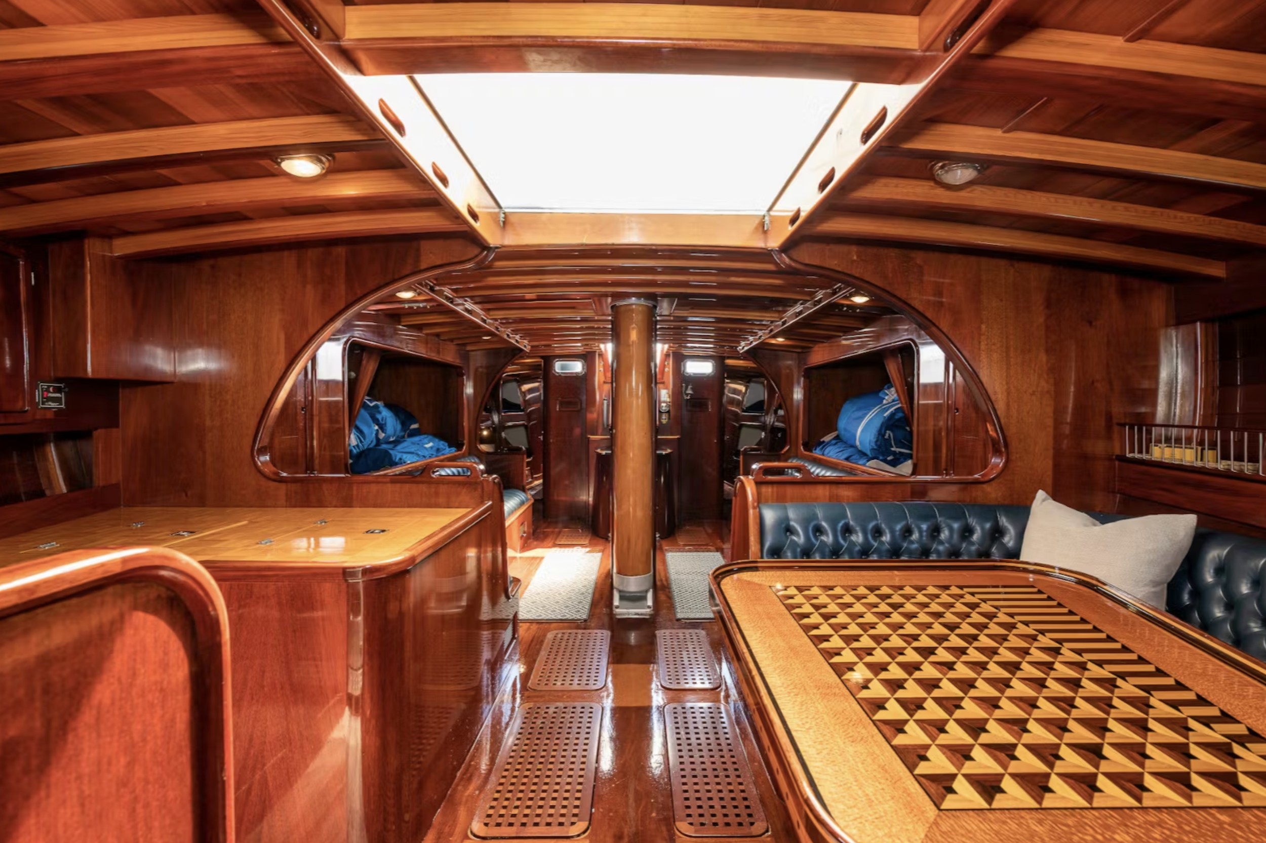 “There are no shortcuts in the craftsmanship and woodworking of Passing Wind, all done by Carpenter himself. The one-piece solid slab doors of Honduran mahogany and beautiful inlay work on the counters, tables and transom are worthy of any art gallery. The boat is built entirely of wood with one-inch-thick decking constructed from three layers of laminated red cedar and mahogany. Custom hardware and fine leather-covered settees and cushions speak to the owner’s wish to have a competitive ocean racing yacht with sumptuous yet practical accommodations. Passing Wind is spectacular in all facets…”